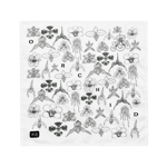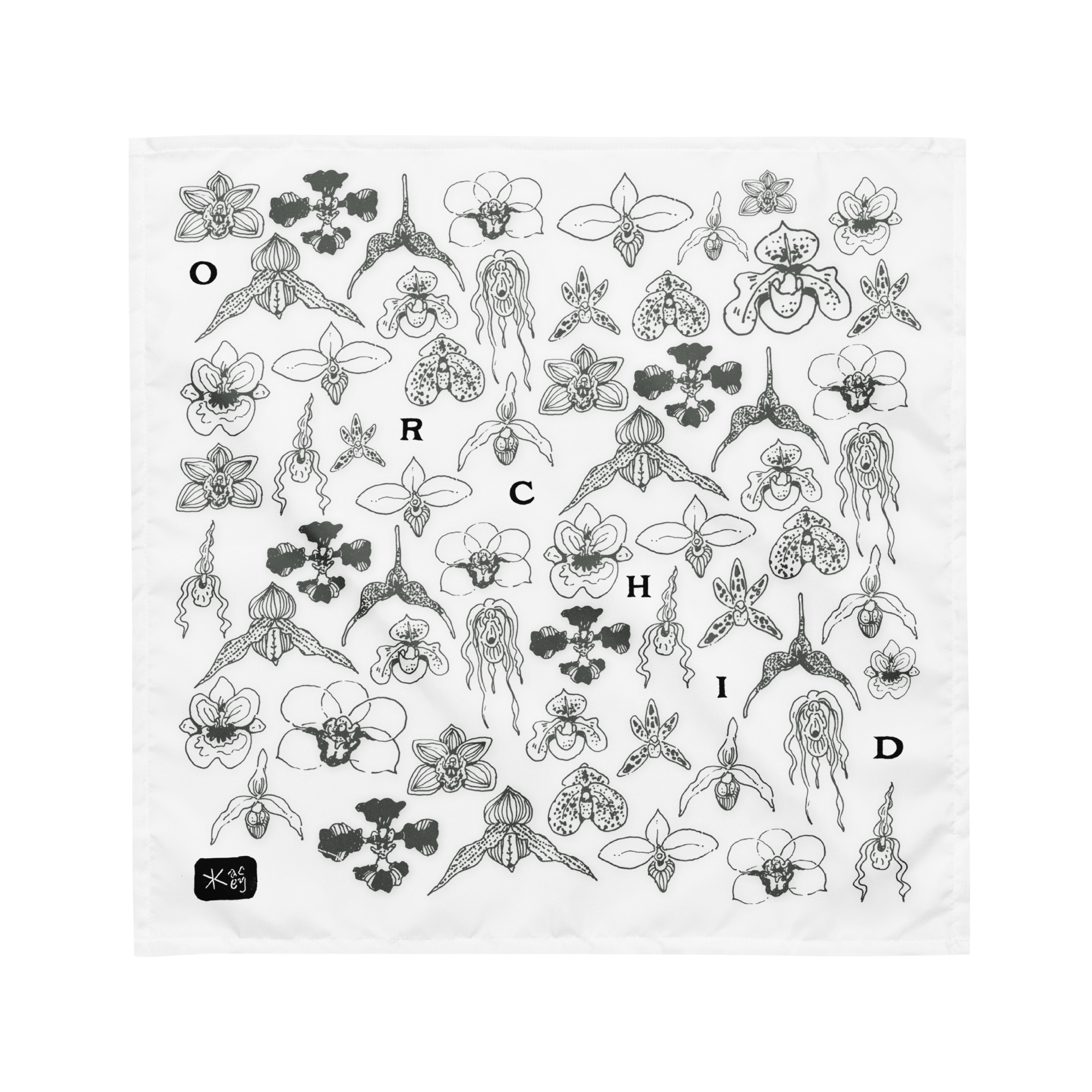 27.5" x 27.5" bandana with 13 unique orchid illustrations